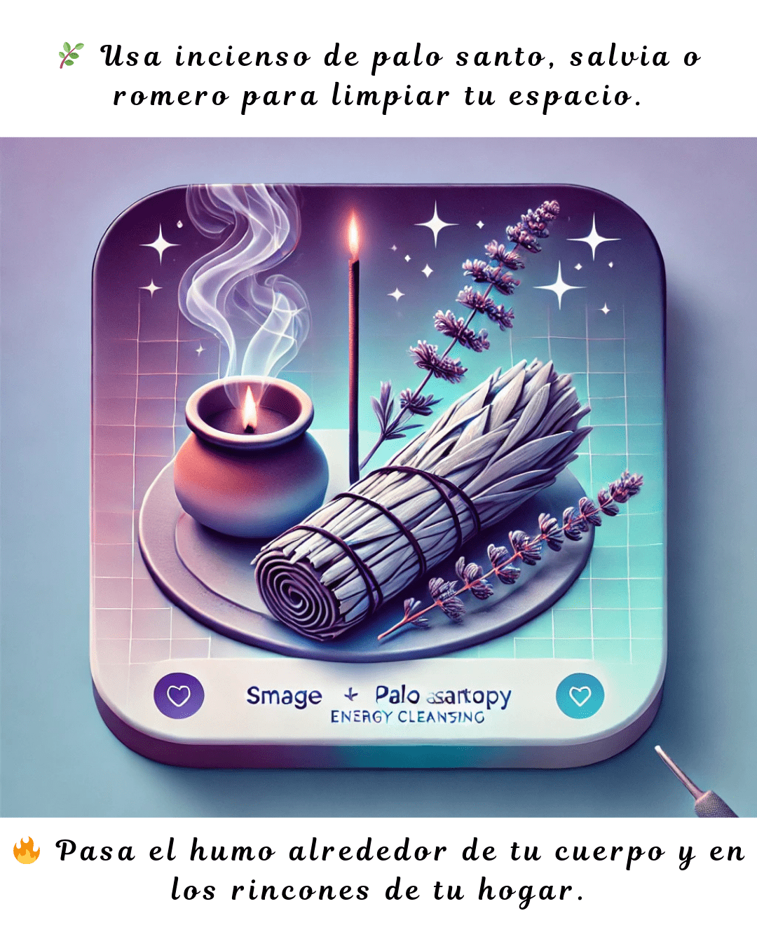 El humo sagrado de palo santo, salvia, romero o lavanda limpia el ambiente y el aura.