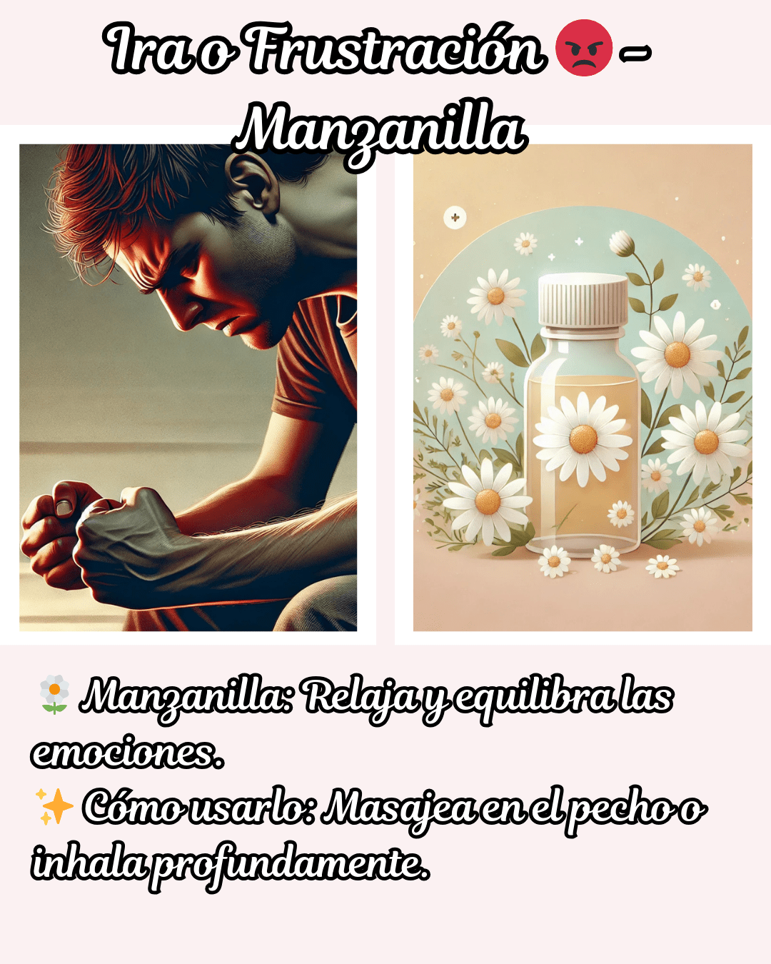 🌼 Ira o frustración → Manzanilla: suaviza las emociones y relaja el corazón con dulzura.