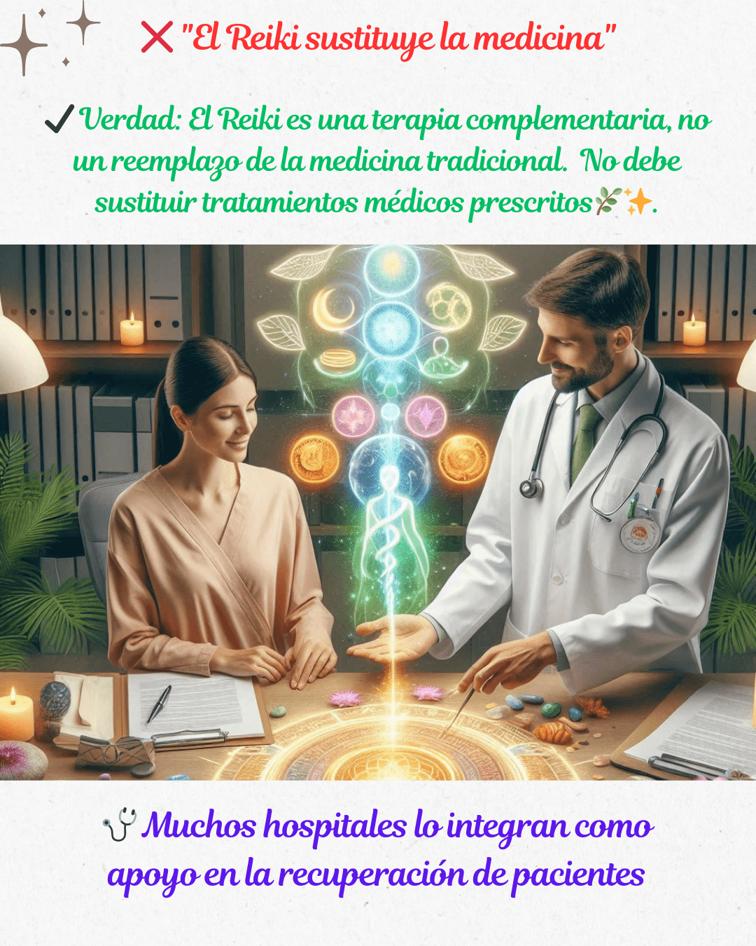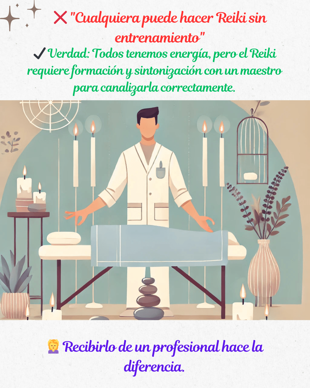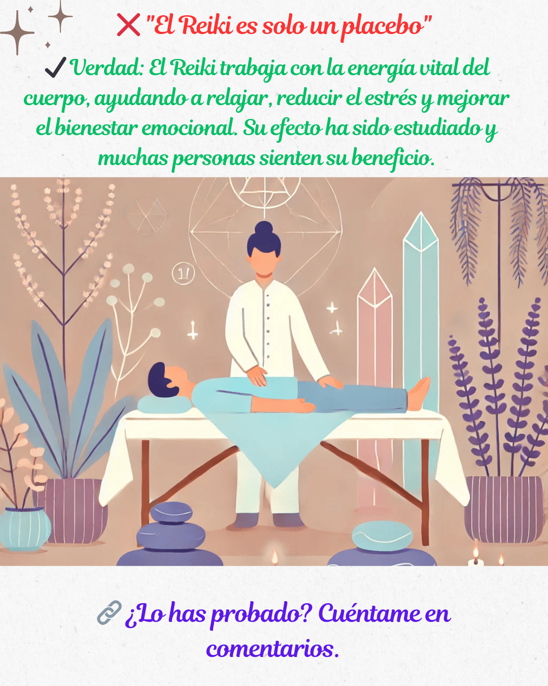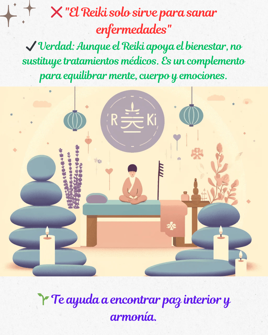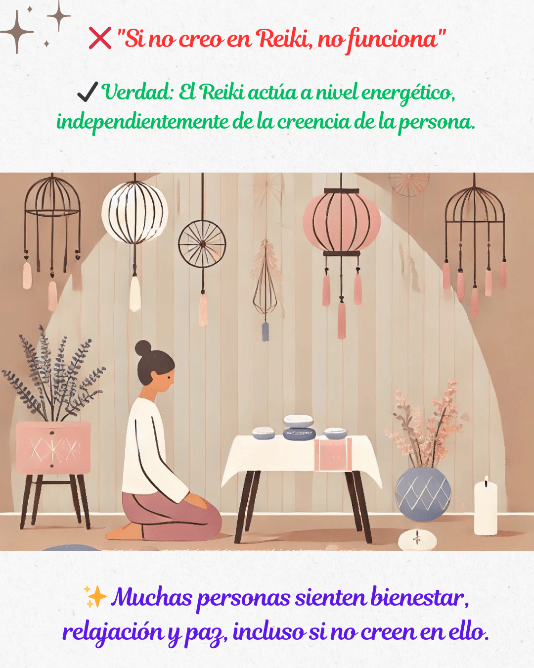 ✔️ Realidad: El Reiki es beneficioso para cualquier persona, en cualquier momento. No solo trata enfermedades físicas, sino también el estrés, la ansiedad, los bloqueos emocionales y todo tipo de desequilibrio. 🌸✨