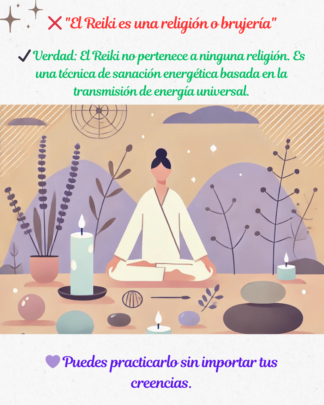 ✔️ Realidad: El Reiki no está vinculado a ninguna religión ni creencia en particular. Es una práctica espiritual que te conecta con tu energía vital y el Universo, pero puedes practicarlo independientemente de tu fe. 🌿💖